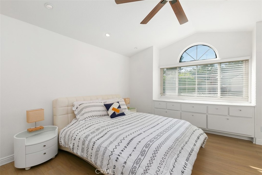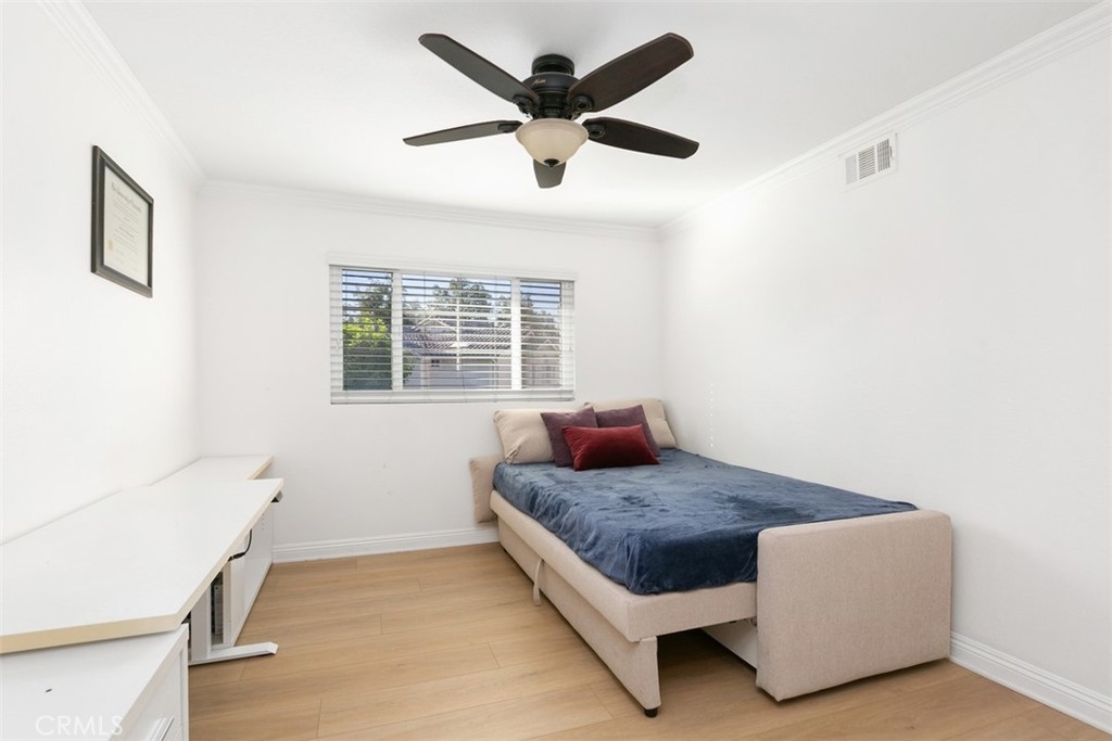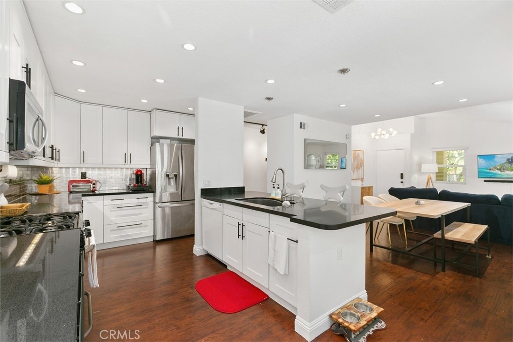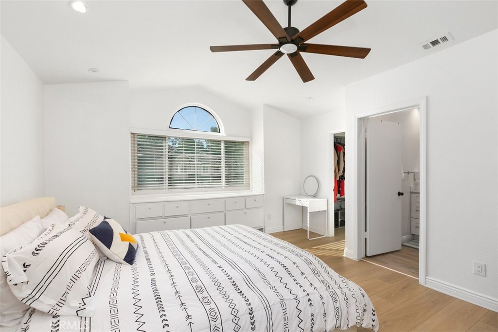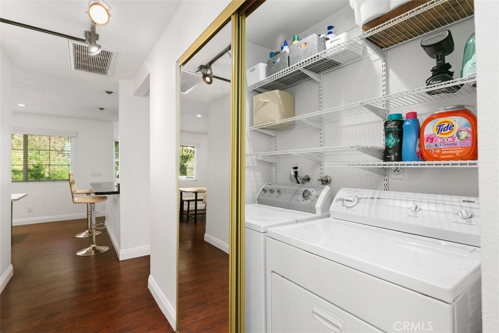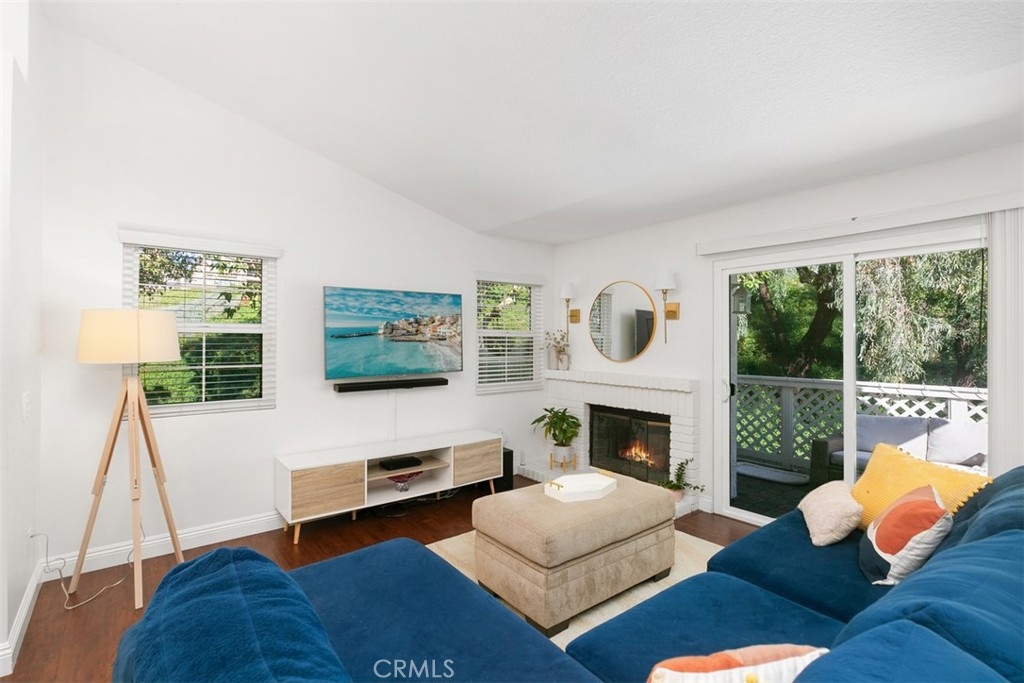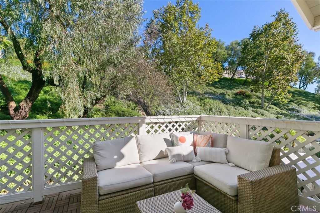 Welcome home to the most upgraded 3 bedroom, 2 bath open floor plan in the serene Willow Glen community. Your home comes fully equipped with newer wood look floors, a large galaxy granite kitchen island, white shaker cabinets, subway tile backsplash, stainless steel appliances, recessed lighting, upgraded bathrooms, dual pane vinyl windows, ceiling fan lights, and vaulted ceilings. This upstairs single story unit provides plenty of natural light and faces the community maintained greenbelt hill. A 2 car detached garage belonging to the unit has ample storage and is located directly below the front of the unit. 2 of the bedrooms have walk in closets, one of which is the primary suite with its own bathroom with a walk in full tile shower. Other features include, HVAC, recessed lighting throughout, dual pane vinyl windows, a rear private patio perfect for entertaining, inside laundry in the hallway hidden by folding doors, and upgraded bathrooms. The HOA recently updated the community in the last couple of years. The community is conveniently located just a short drive to shopping centers, restaurants, parks, and the major transportation corridor here in Orange County.