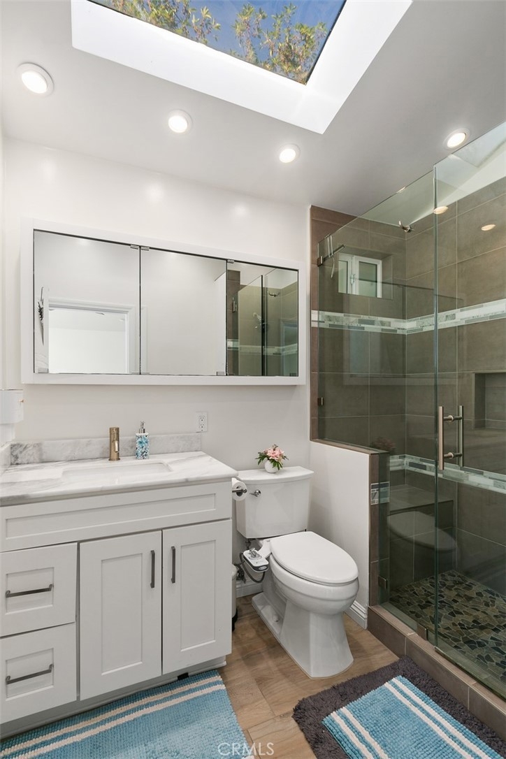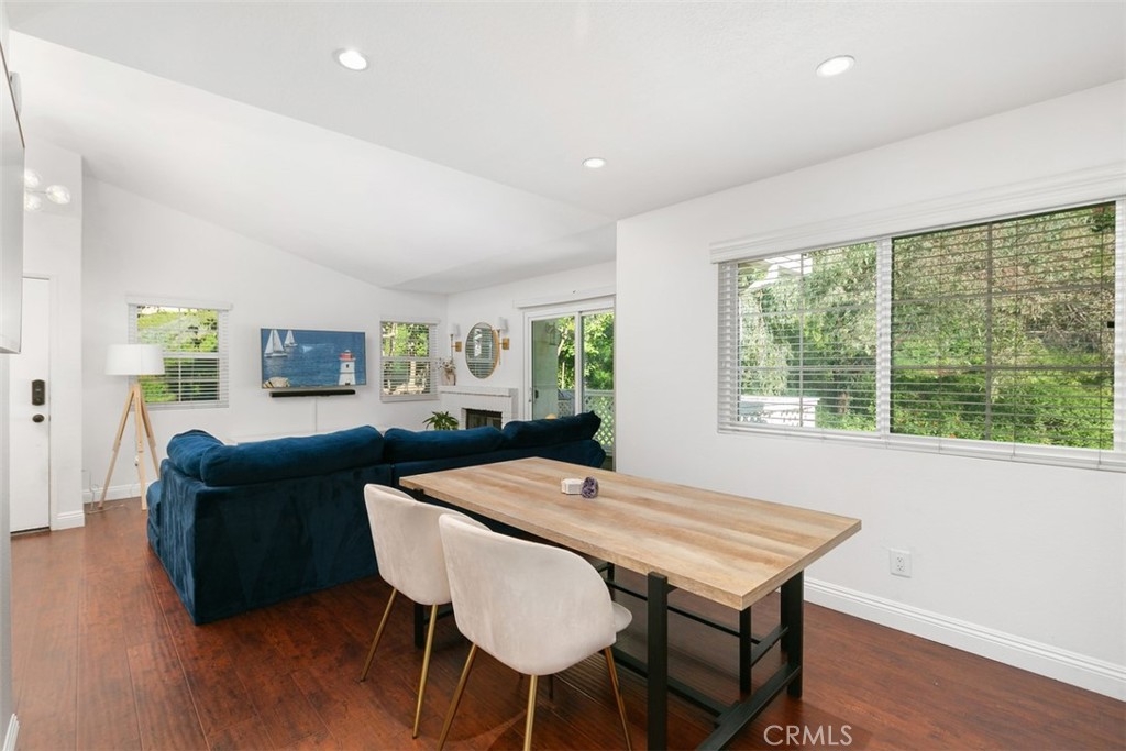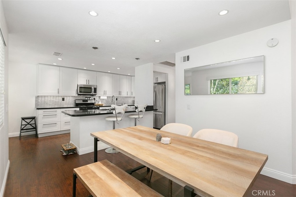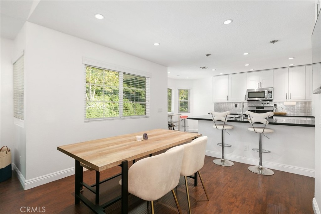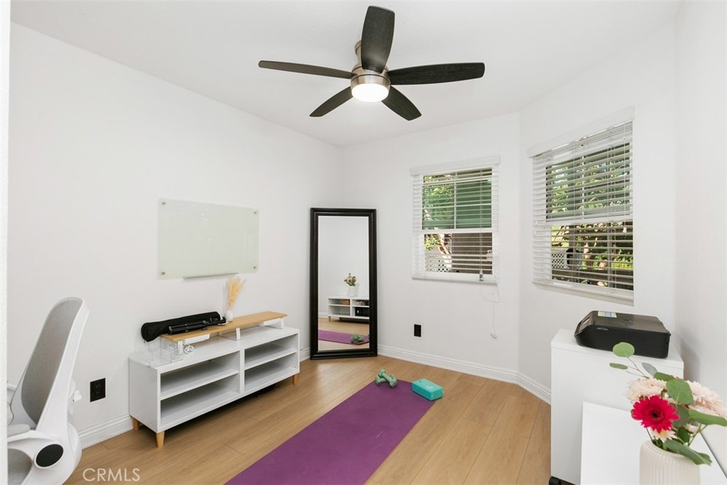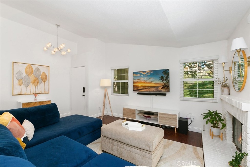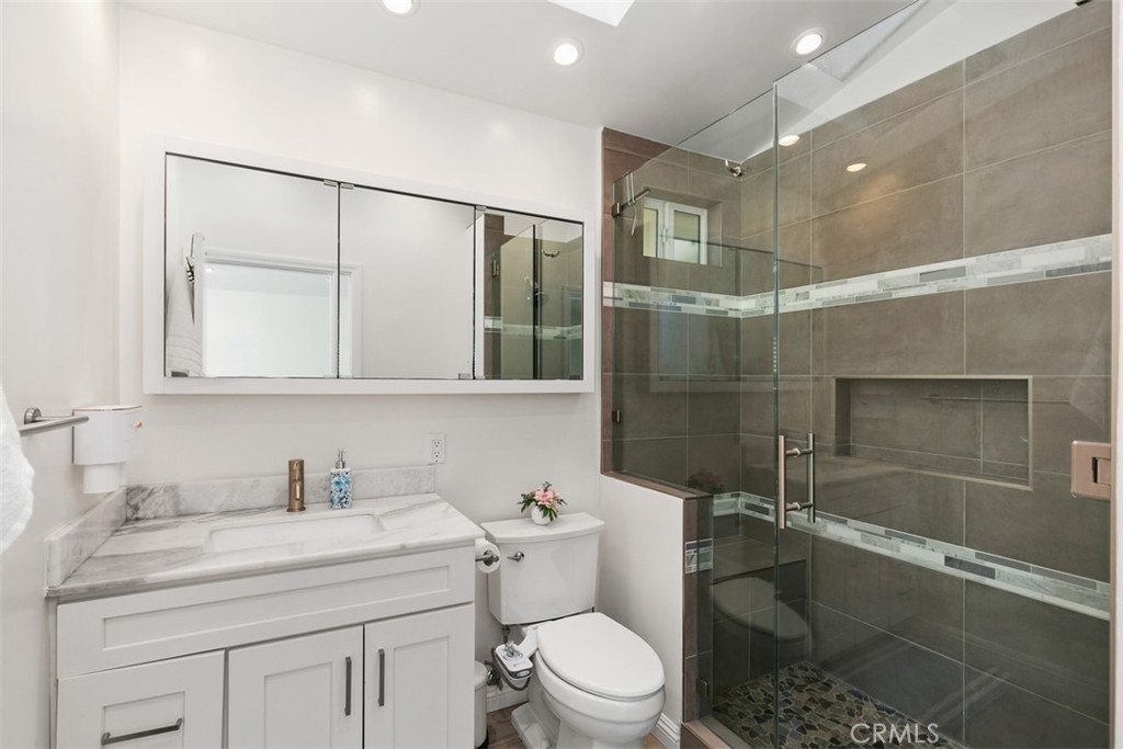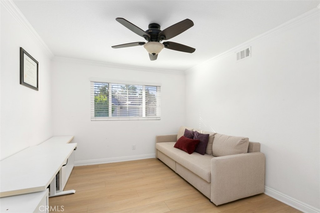 Welcome home to the most upgraded 3 bedroom, 2 bath open floor plan in the serene Willow Glen community. Your home comes fully equipped with newer wood look floors, a large galaxy granite kitchen island, white shaker cabinets, subway tile backsplash, stainless steel appliances, recessed lighting, upgraded bathrooms, dual pane vinyl windows, ceiling fan lights, and vaulted ceilings. This upstairs single story unit provides plenty of natural light and faces the community maintained greenbelt hill. A 2 car detached garage belonging to the unit has ample storage and is located directly below the front of the unit. 2 of the bedrooms have walk in closets, one of which is the primary suite with its own bathroom with a walk in full tile shower. Other features include, HVAC, recessed lighting throughout, dual pane vinyl windows, a rear private patio perfect for entertaining, inside laundry in the hallway hidden by folding doors, and upgraded bathrooms. The HOA recently updated the community in the last couple of years. The community is conveniently located just a short drive to shopping centers, restaurants, parks, and the major transportation corridor here in Orange County.
