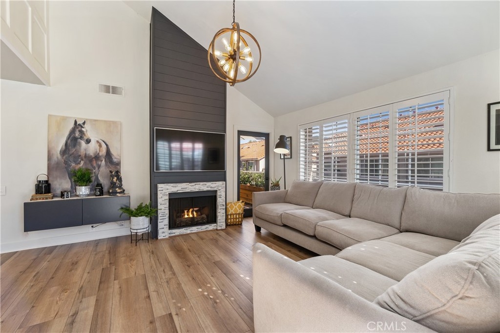 Come see this amazing home that is a model of affordable luxury! This one bedroom TURNKEY END UNIT with a versatile ENCLOSED LOFT is in the desired community of Portola Hills, just steps away from hiking and biking trails! Boasting tasteful upgrades throughout and plenty of natural light, this Trabuco Canyon condo has been the pride of one family for over 17 years. The front porch is an entertainer’s delight, with plenty of room for a BBQ and dining. As you enter, you will immediately notice the open architecture, high vaulted ceilings and the dramatic gas fireplace with floor to ceiling shiplap, a perfect place to gather friends and family. Seamlessly connected is the remodeled kitchen with soft-close shaker cabinets, granite countertops, stainless steel appliances and an oversized sink. Spanning the entire unit is brand new water-resistant, multi-width plank flooring. The remodeled bathroom, features a new vanity, dual-flush water conserving toilet, custom shower with floor to ceiling tile, and built-in shelving. The main floor master bedroom boasts a beautiful shiplap accented wall, vaulted ceiling and balcony. You will find a second floor enclosed loft that can be used as a second bedroom or office, with amazing natural light. Plantation shutters, recessed lighting, a newer HVAC system, hints of mountain views, and an attached garage adds to this must see home! Community highlights are parks, pools, tennis, shops, great restaurants, easy access to Toll Road and more!