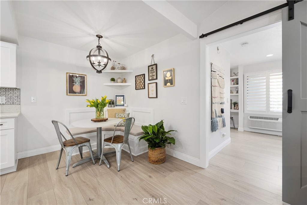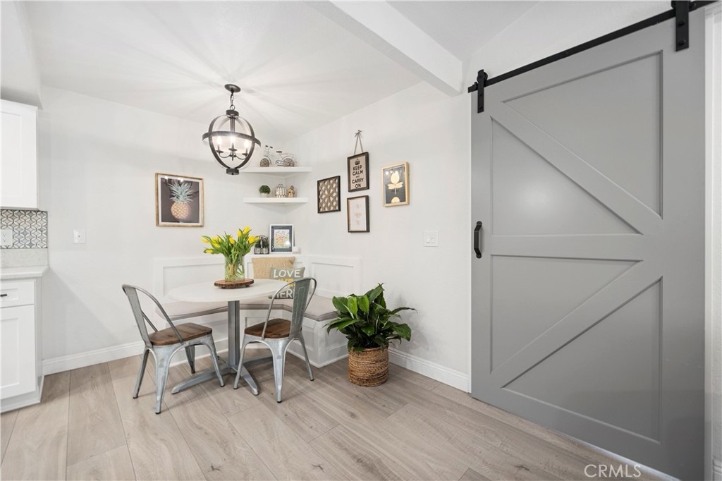 This turnkey condo is ideally located in the community of Pheasant Creek. This upper-level, one bedroom is remodeled and updated. High vaulted ceilings, wide wood laminate flooring, recessed lighting, custom barn door going into the bedroom. Kitchen is bright with white shaker cabinetry, Quartz countertops, farmhouse sink, upgraded hardware and fixtures. Custom tile backsplash and stainless-steel appliances. Built-in banquet dining seating with storage, custom shelves. Bedroom has built-in desk and shelving and walk-in closet. Plantation shutters and high ceilings. Remodeled bathroom with quartz topped vanity, framed vanity mirror. Tub & shower with custom tile surround. Private balcony for relaxing. Outside laundry closet. One car garage. The community has 4 pools, lighted tennis courts. Close to shopping, parks, and toll road. This is a must see.