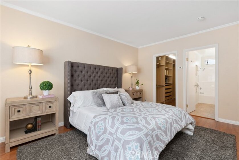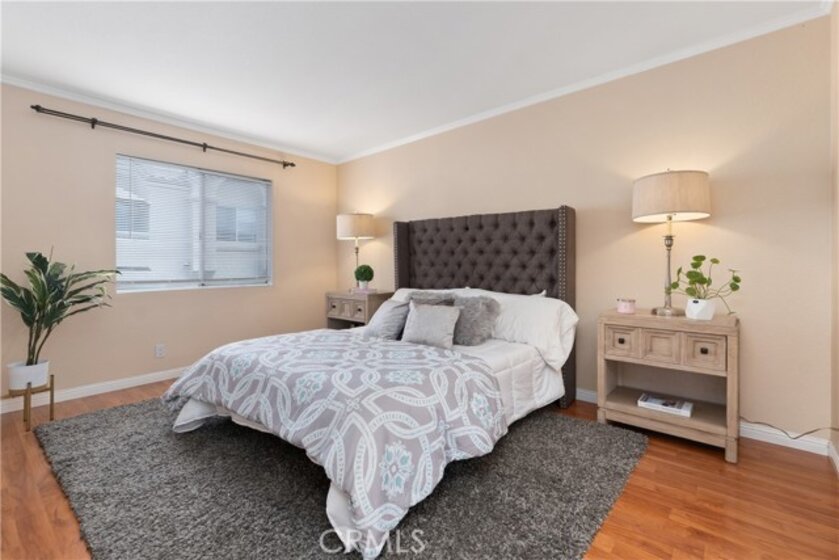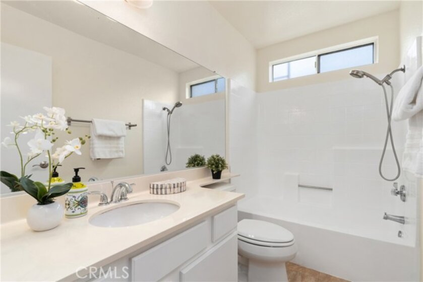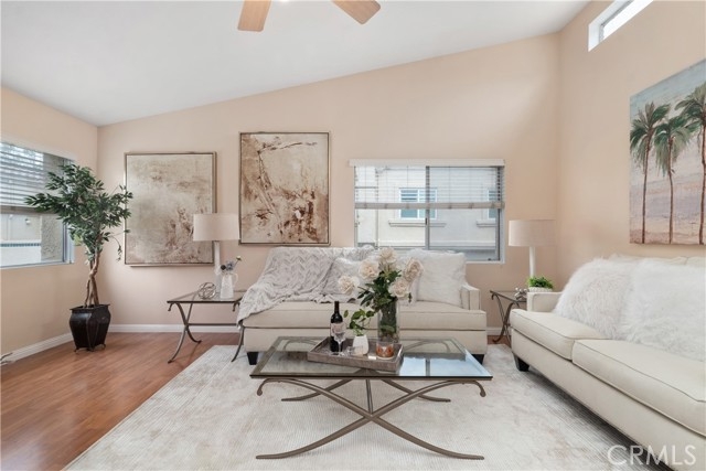 Welcome home to this bright and inviting residence in the highly sought-after Vista Del Flores community. Filled with natural light and warm finishes, this end-unit blends comfort, style, and modern living. Step into an open living space with soaring ceilings, laminate wood floors, and a cozy fireplace perfect for everyday relaxation. Large windows and a private balcony bring in peaceful greenbelt views, creating an ideal spot for morning coffee or evening unwinding. The kitchen features white cabinetry and all-new stainless steel appliances. The primary suite offers crown molding, neutral tones, and an impressive walk-in closet with custom storage. The second bedroom is generously sized with its own full bath. Great for guests, family, or a home office. Direct-access 2-car garage with plenty of storage and a washer and dryer. The community offers a pool, parks, and lush walking paths. Close to shopping, dining, and top-rated schools. Move-in ready and beautifully maintained.