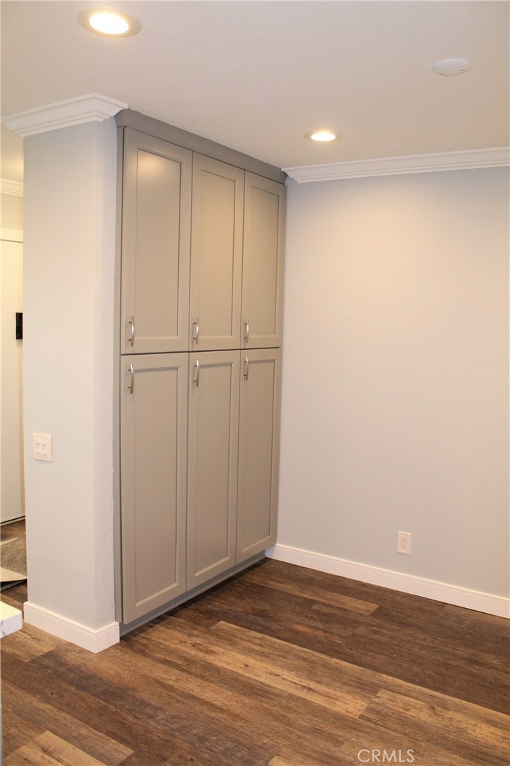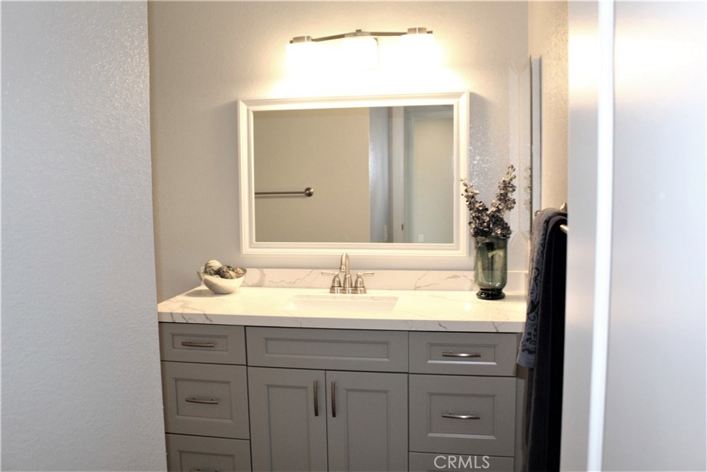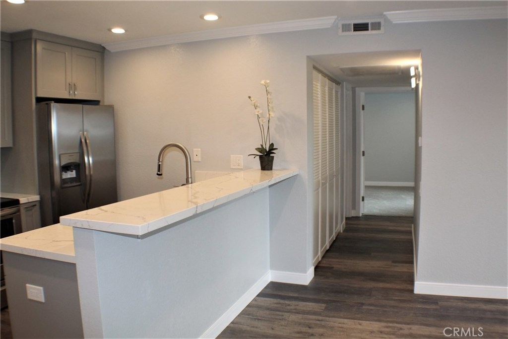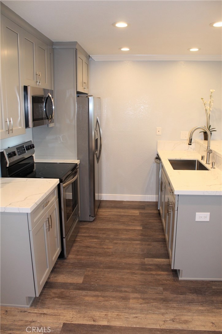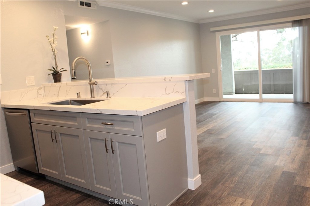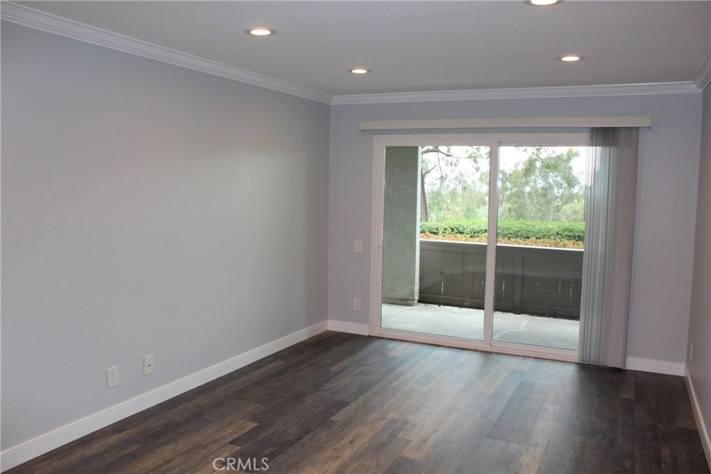 Location! Location! Absolutely stunning, completely remodeled, ground level 2 bedroom condo centrally located within Lake Forest. Everything in this gorgeous home has been completely upgraded! Highlights include wood laminate flooring, new paint, large baseboards, crown molding, new window and sliding doors, and custom lighting fixtures. The brand new kitchen has been accented with new cabinets with self closing doors, quartz countertops, stainless steel appliances including refrigerator, custom faucet, and new recessed lighting. The adjacent dining area has been equipped with new storage cabinets. The large mater bedroom boasts new French doors along with new mirror wardrobe doors and new carpet which is next to the bathroom that also has quartz counters, new vanity, and upgraded lighting. Secondary bedroom with crown molding, recessed lighting, mirrored wardrobe doors, and new sliding door that leads out to the large outside patio with incredible tree top and park views. Washer & dryer area with new cabinets is also conveniently located within the unit. HOA fee includes water and trash. Direct access to nearby Rimgate Park for playground, picnics, tennis, basketball and hiking. Low tax and no Mello Roos. This home is a must see!