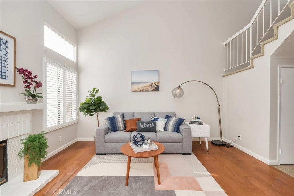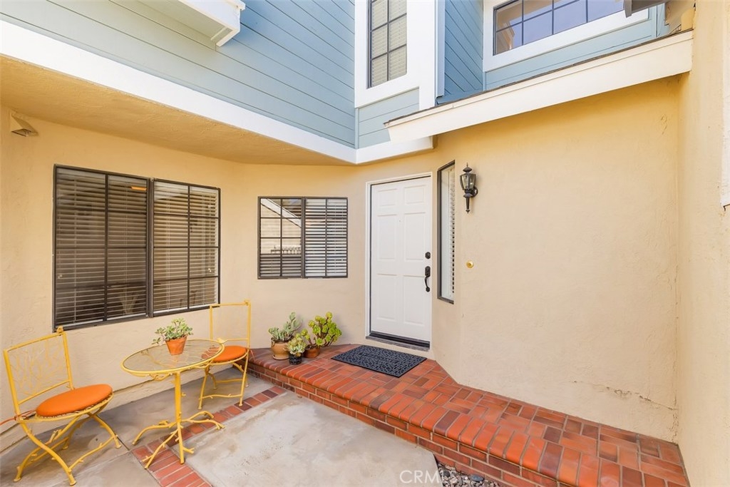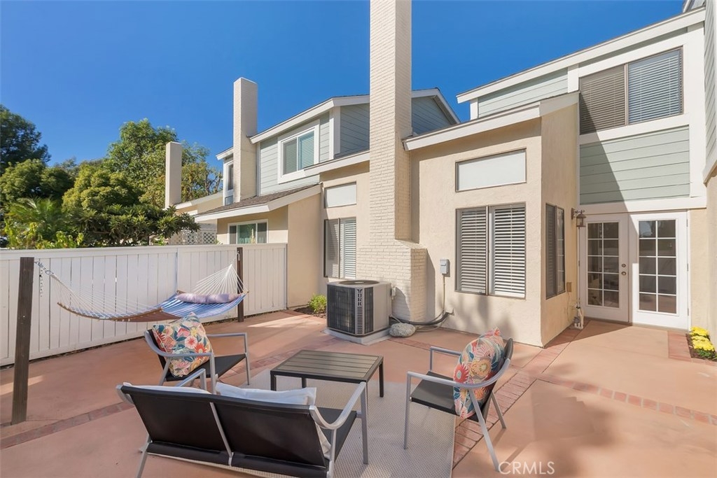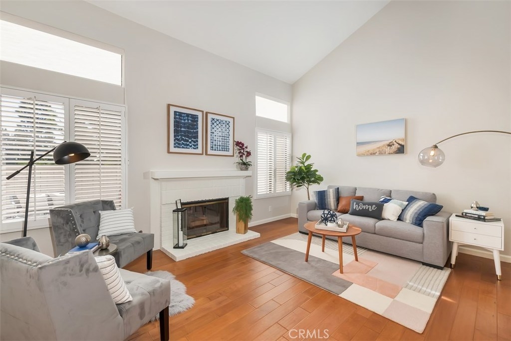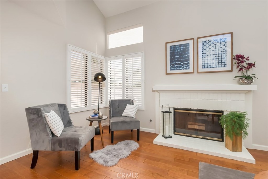 Gorgeous town house in desirable Hillsview Community. Immaculate & tastefully upgraded. Gated courtyard entry leads you into this beautiful home. Large living room with vaulted ceilings, plantation shutters, & cozy fireplace. Separate dining room with French doors leading to a large enclosed patio with no neighbors directly behind it. Updated kitchen with white cabinets, stainless steel appliances, granite counters & glass tile back splash. Breakfast nook for casual dining. The dramatic stair well leads you upstairs to two generous bedrooms each with a private ensuite bath featuring trending wide plank laminate flooring. The master suite features vaulted ceiling, dual vanities and two closets. Attractive plank wood flooring in the living room & dining room, 18” faux stone tile in entry, kitchen, nook & powder room, plush carpeting, plantation shutters, wood blinds & fresh light (grey/beige) paint add to the appeal of this home. Close to Irvine Spectrum and two large city parks including the newly renovated Tamarisk Park which includes a new baseball field, playground, basketball court, restroom facility and picnic area just up the street! Serrano Highland Association offers access to four tennis courts, basketball court, pool and spa. Minutes from 405 and 5 freeways, toll roads, Irvine Spectrum, local shopping & proximity to schools makes this location very desirable.