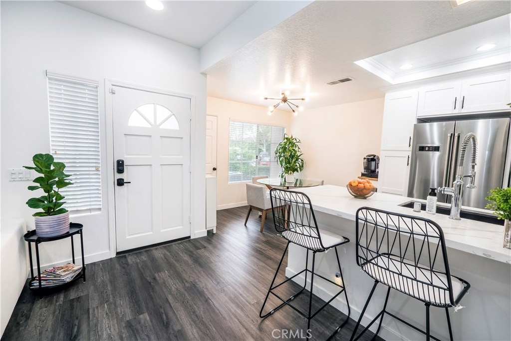 Stunning single story, first floor condo with open concept kitchen/dining/living room area that is perfect for entertaining small and safe gatherings. Indoor laundry and additional storage make this home functional as it is beautiful. Seller has made extensive upgrades including the SPC floors throughout that come with manufacturer's warranty, very recent upgraded breaker circuit panel and the A/C heating unit is only 3 years old. Great community with one assigned parking space and additional guest parking is available. Amazing opportunity to own in one of Orange County’s best kept secrets.