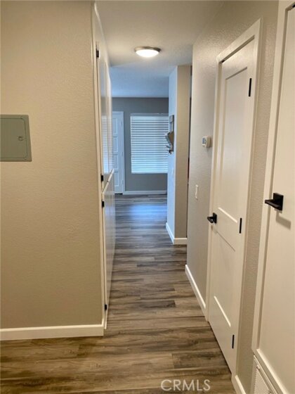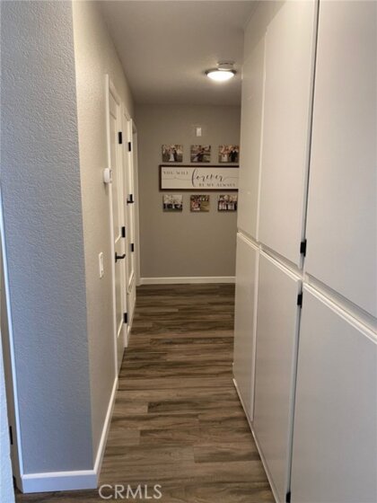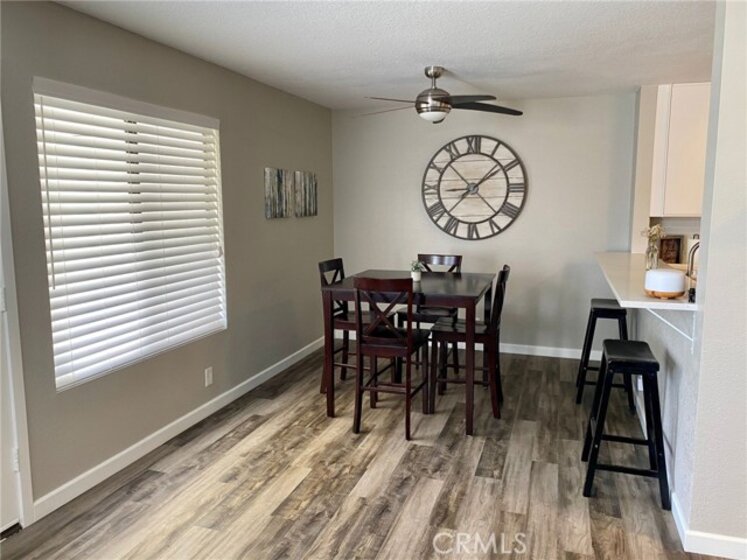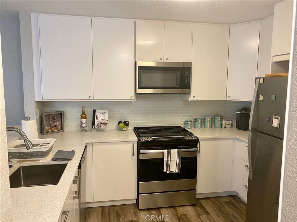 This beautiful 2 bedroom, 957 sq ft condo is conveniently located in Lake Forest. Make it your home for the Holidays! Large elevated patio area, private location, and plenty of living space. Inside you'll find a beautiful kitchen with white cabinets, pantry, quartz countertops, breakfast bar and stainless steel appliances. Throughout the house is luxury plank flooring and baseboards. In the bathroom you'll find a full bath/shower condo, vanity with plenty of counter space AND a separate laundry area with full size washer and dryer. Plenty of natural light fills the spacious living and dining room areas. The living room's brick fireplace adds a touch of warmth throughout. There are plenty of built in cabinets for extra storage. The primary bedroom is spacious enough for king bed, has a walk in closet, and the spare room is perfect size for a guest/children's room. HOA features private streets, green belts, two spas, one pool and includes trash collection. Don't let this beautiful property pass you by!