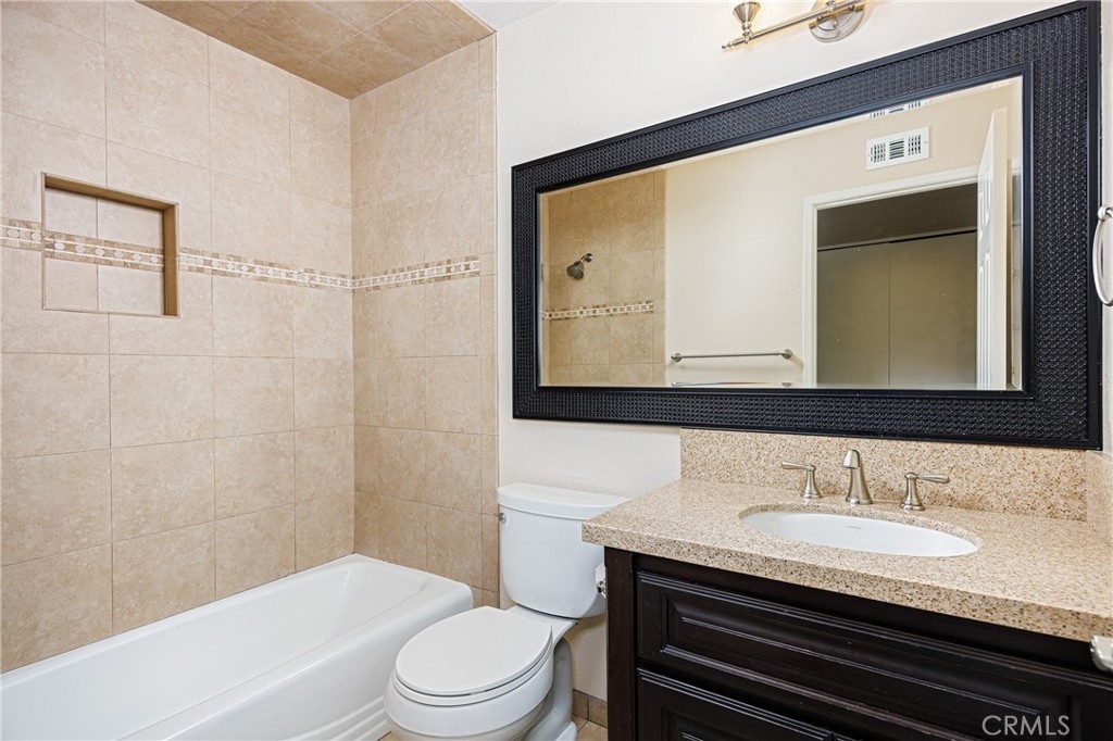 MOVE-IN READY, TURNKEY HOME! Welcome to this beautifully upgraded and incredibly spacious two-story home, tucked away in the highly desirable Cedar Glen community! Nobody above or below you. Step inside to discover an open-concept layout featuring a large living room filled with natural light, a full dining area, two generously sized bedrooms, and a private patio perfect for relaxing or entertaining. The remodeled kitchen is a true showstopper, featuring solid maple cabinetry, gleaming granite countertops, stainless steel appliances, and an abundance of storage space—ideal for any home chef. The home is freshly updated with brand NEW interior paint, plush NEW carpet with upgraded thick padding on the staircase and upper level, and sleek 20”x20” porcelain tile flooring downstairs. Both bathrooms have been stylishly renovated with rich espresso maple cabinets, quartz countertops, new toilets, updated fixtures, and beautiful custom tilework in the upstairs full bath. Additional upgrades include a newer A/C and furnace, new light fixtures, modern 6-panel doors with updated hardware, and a convenient under-stair storage area. Upstairs, both large bedrooms offer a large walk-in closet, and the laundry area—complete with washer and dryer—is conveniently located between the bedrooms. Step outside to your private patio, surrounded by a newer wood fence—ideal for afternoon BBQs or quiet evenings under the stars. The home comes with a covered carport with extra storage, a second reserved parking spot, and ample guest parking. Enjoy community amenities including a sparkling pool, relaxing spa, and clubhouse. HOA covers water, trash, sewer, and basic cable. All this, just minutes from parks, trails, shopping, restaurants, top-rated schools, hospitals, and major freeways. Don’t miss your chance to call this incredible home yours—WELCOME HOME!