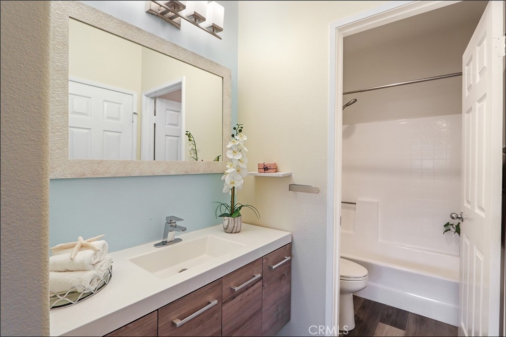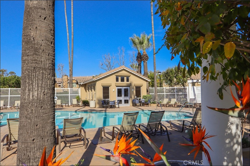SPACIOUS FLOOR PLAN WITH HIGH CEILINGS, LOTS OF NATURAL LIGHT AND UPGRADES! Awesome property offering a large living and dining room with fireplace, sliding glass doors leading to the private balcony and a delightful kitchen opens to the living areas with lots of cabinets, upgraded stainless steel appliances and breakfast bar. Spacious master suite featuring a walk-in closet with closet organizers, and remodeled master bathroom featuring a designer style vanity with upgraded fixtures. Second bedroom and full second bathroom with designer style vanity and upgraded fixtures. Upgraded dual glazed windows and sliding door, upgraded designer style flooring and baseboards, ceiling fans and upgraded lighting fixtures, water softener and filtration system, attached garage with direct access and so much more. Resort style amenities including pool, spa, exercise room, playgrounds, and clubhouse and nearby hiking, biking and Whiting Ranch Wilderness Park and nature trails!