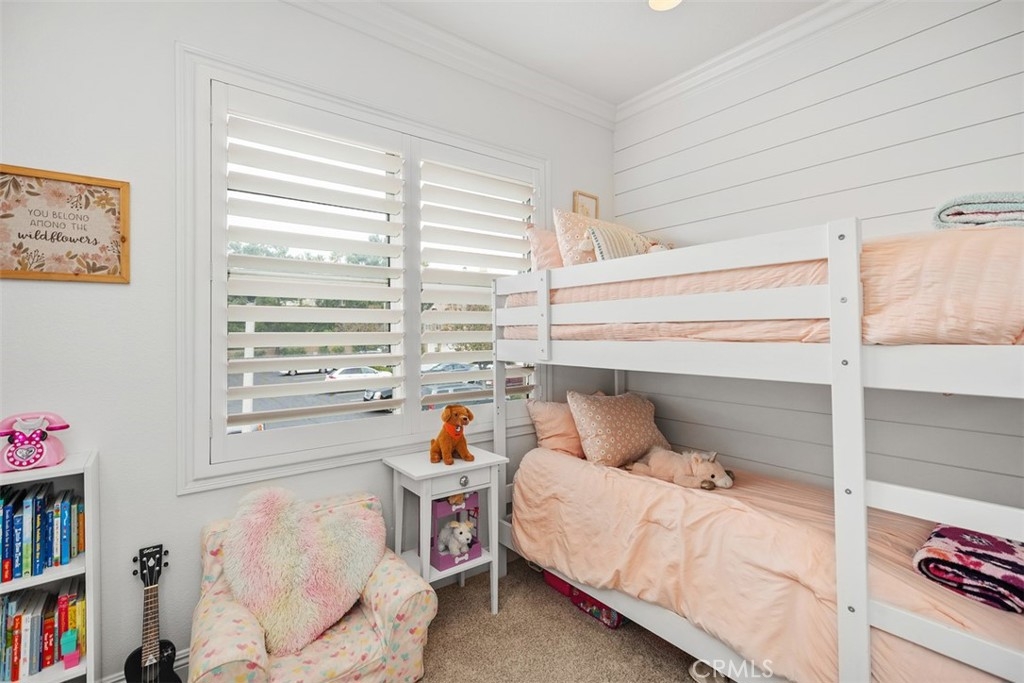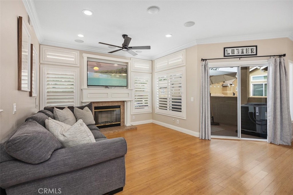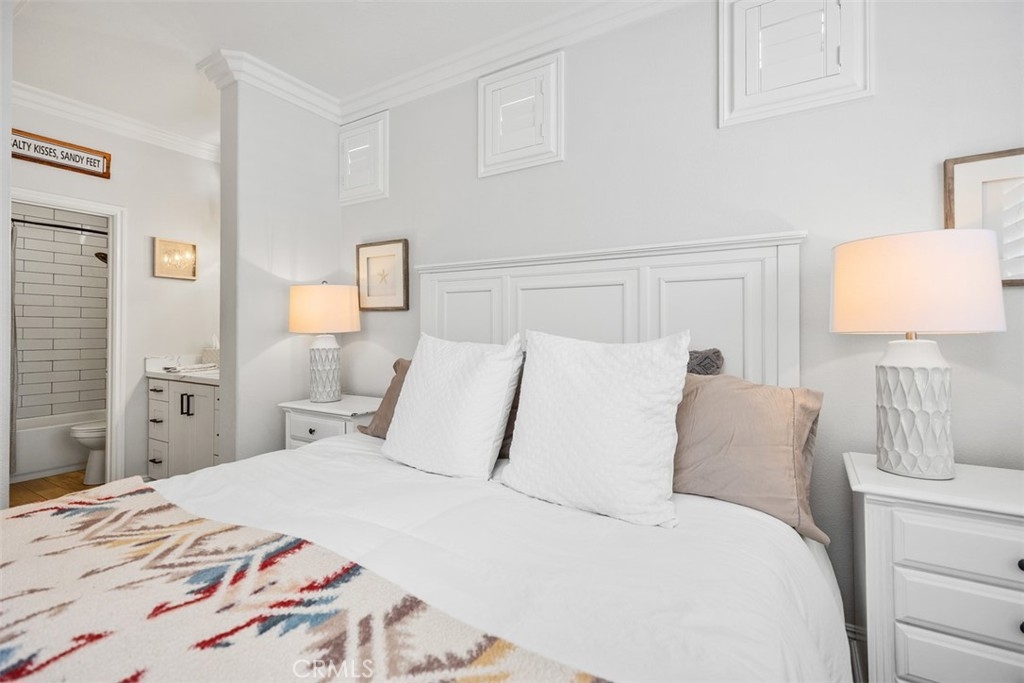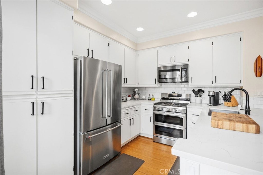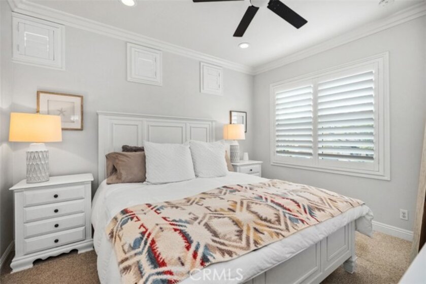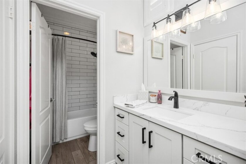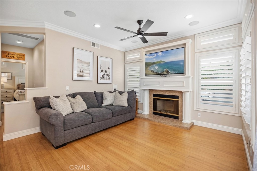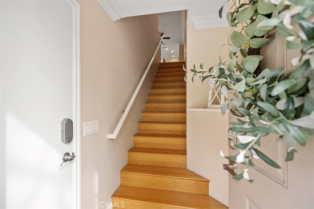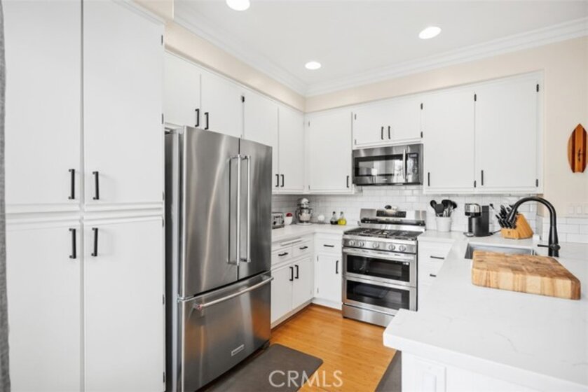 Welcome to this beautifully positioned carriage-style home where all the living spaces are thoughtfully located on one level above the convenient direct-accss one car garage. Perfectly located in the desirable Portola Hills community of Lake Forest. As an end unit, this home enjoys added privacy, and an abundance of natural light, along with the rare advantage of being adjacent to a private grassy greenbelt. This beautifully maintained 2-bedroom, 2-bath residence offers an open, light-filled floor plan and tasteful designer finishes including crown moulding throughout. A welcoming living area centers on a unique “fire & ice” glass fireplace and flows seamlessly to the open kitchen and the private outdoor balcony — ideal for morning coffee, evening BBQs or relaxing and unwinding. The heart of the home is the renovated kitchen, featuring brand-new stainless steel appliances, quartz countertops, a large steel farmhouse sink, modern fixtures and white cabinetry. Crown molding and custom plantation shutters add refined architectural detail, while new ceiling fans, newer carpet and fresh finishes provide comfort and style. Recent high-end HVAC installation ensures efficient climate control year-round! Both bedrooms are generous in size. The master suite has been thoughtfully updated with a full remodel — new vanity, soaking tub, modern tile surround in the shower, new porcelain tile and contemporary lighting. The second bedroom includes a custom shiplap wall and closet organizer for enhanced storage and organization. Residents enjoy HOA amenities such as a private community pool, spa and fitness center, plus plentiful guest parking and low HOA fees. The location is exceptional within Saddleback Valley — close to parks, sports fields, top hiking and biking trails at Whiting Ranch Wilderness Park, shopping, dining, easy transportation routes and a short drive to world-class beaches along the Pacific coastline. Turnkey condition and thoughtful upgrades make this condo an outstanding opportunity to enjoy Southern Orange County living. All of this is complimented by low property taxes and affordable HOA fees, making this an exceptional value. Schedule your showing today!
