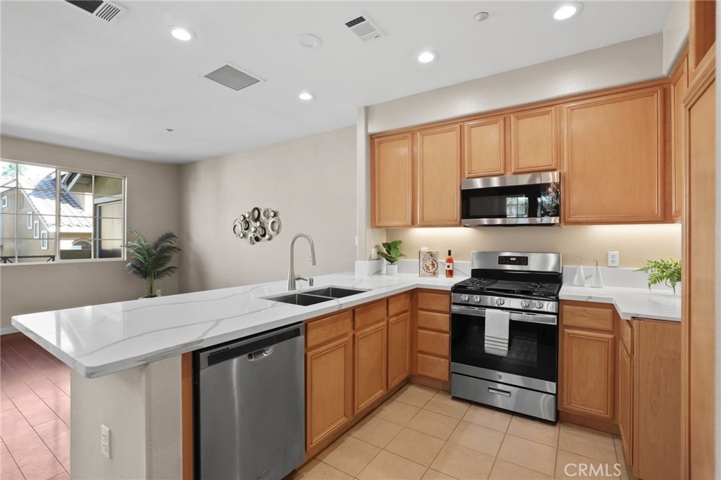Absolutely gorgeous and in move in ready condition! Private popular upper end unit floorplan! Loads of great upgrades include, gorgeous extensive hardwood flooring, New light custom modern paint throughout, New upgraded kitchen quartz counters, New stainless range and microwave, New upgraded baths with light quartz counters, New upgraded custom lighting and LED's, New custom blinds, Whole house fan, etc. etc.! Inside laundry area! High ceilings with loads of windows! Light, bright, airy and open concept floorplan! Two car garage with direct access! Awesome balcony to entertain and BBQ! Premium quiet mid tract location! No Mello Roos! Better act fast on this special opportunity! Priced to sell quick!!!!!!