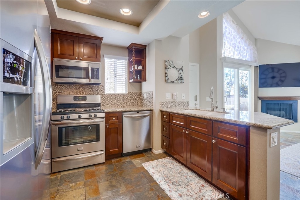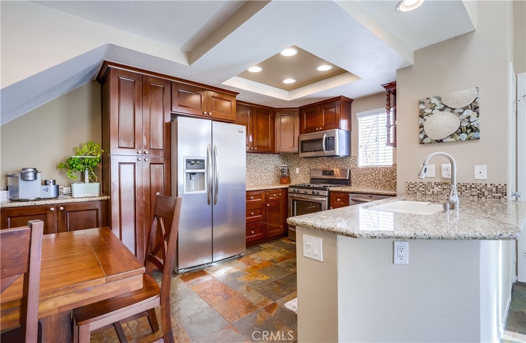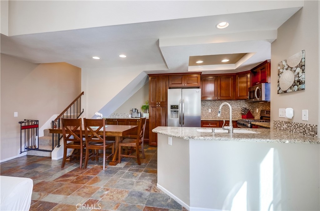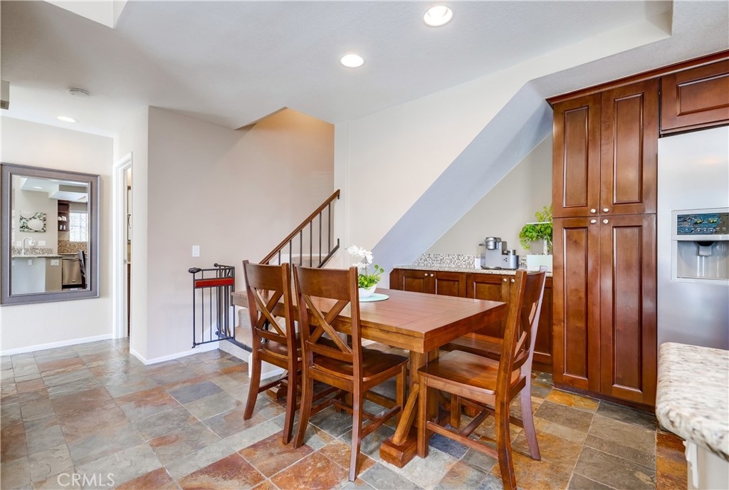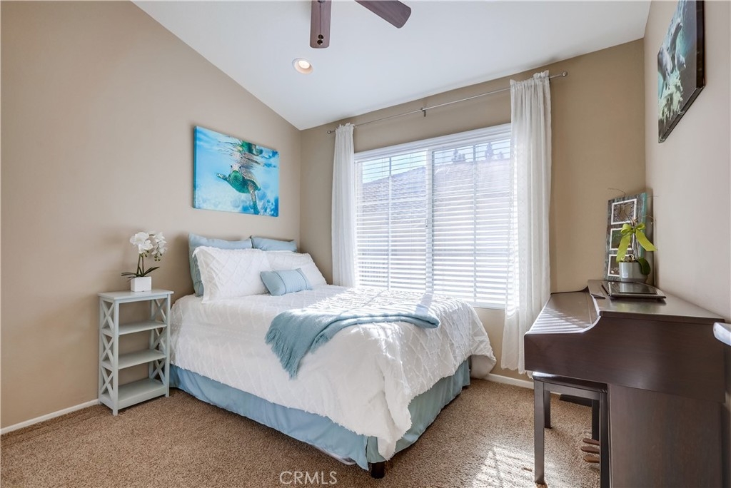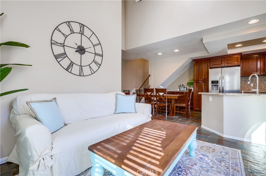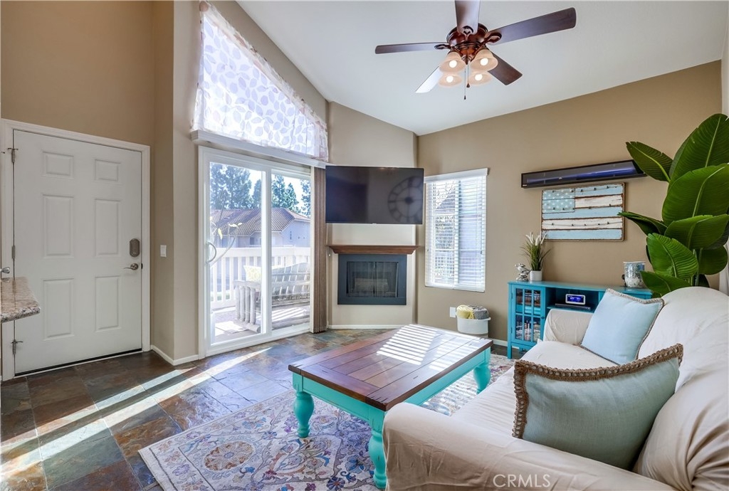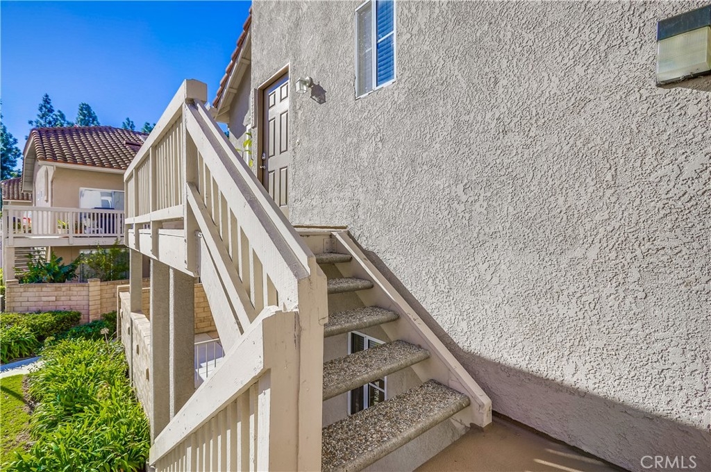 Gorgeous carriage end unit located in the desirable Canyon View West community nestled up to the foothills of Santiago Peak at the entrance of iconic Modjeska Canyon and Santiago Canyon, surrounded by the picturesque rolling hills of Whiting Ranch, providing a beautifully serene wildlife setting. The sunny front balcony entrance looking out towards the gorgeous hillsides creates an awesome first impression. Step inside and soak in the light filled living space with soaring vaulted ceilings and an open concept floor plan. The living room is filled with natural light and is blessed with a cozy fireplace and direct access to the front balcony through sliding doors, creating an ideal indoor-outdoor living space with scenic views. The handsome kitchen has been beautifully updated with exquisite cabinetry, granite countertops, a full glass tile backsplash, recessed lighting, updated faucet and fixtures, Stainless Steel appliances, extra storage cabinets with a coffee bar, and a highly prized breakfast bar, all open to the living room and dining room, perfect for entertaining friends and family. This well-designed floor plan includes 2 bedrooms and 2 bathrooms on the main level including a primary bedroom suite with vaulted ceilings, mirrored closet doors, an elegant private bathroom with updated granite topped dual vanity with custom cabinetry, framed vanity mirrors, updated fixtures and faucets, custom lighting, and a spacious step in shower. The main floor also includes a convenient inside laundry closet. Travel up the stairs to the bonus loft “Mezzanine” space which is perfect for a media room, den, rec room, gym, or home office, and also boasts additional storage areas. Fine features and recent improvements include a new front door, top of the line Tankless Water Heater, new A/C and new Furnace, and a new garbage disposal. This home also includes a 1 car detached garage. This well-maintained community has 2 community pools, a clubhouse, 2 spas, and a tot-lot playground. Endless outdoor activities located just steps away, including numerous hiking and biking trails throughout Whiting Ranch Wilderness, Concourse Park just a short stroll away, Santiago Equestrian center, Portola Park, and Portola Dog Park nearby. Close to Foothill Ranch Town Center with an abundance of shopping and dining and easy Toll Road access.